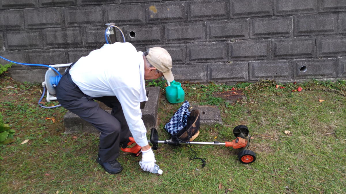 草刈り前の準備中 男2人が各自の都合の良い別々の時間帯に実施。