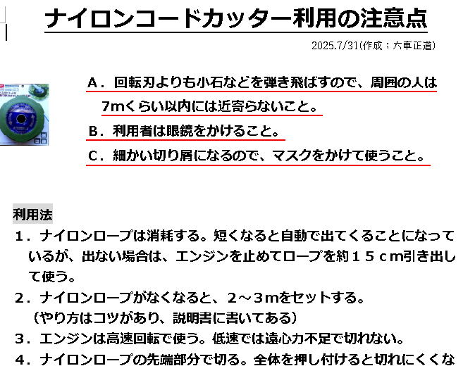 準備 前回に金属刃が傷んでいる、また公園草刈りにはナイロンロープが良いと指摘されていたので、数日前に交換を自治会に提案し、了解得て、消耗品のロープと共に購入。
